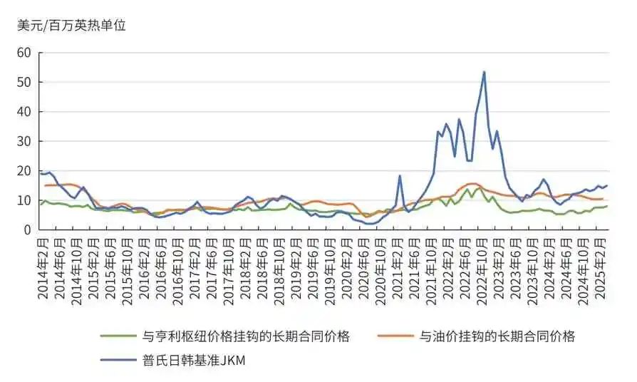 图9 2014—2025年与亨利枢纽价格挂钩的LNG长期合同对比与油价挂钩的LNG长期合同价格及JKM价格走势