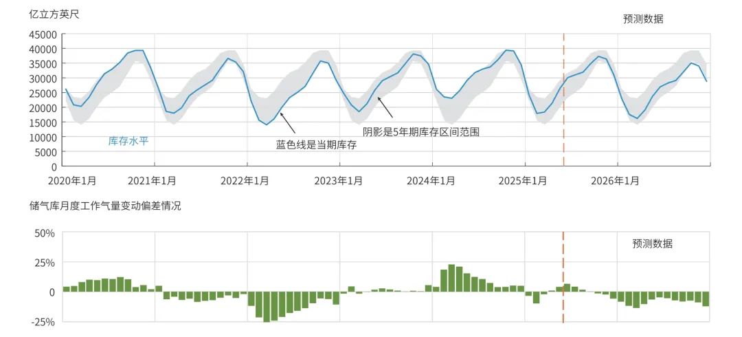由于天然气消费具有较强的季节周期性(见图4),储气库发挥着夏储冬用、平抑季节性供需错配的重要作用。4—10月天然气需求下降,储气库注气,库存水平增加;10月至次年3月天然气需求增加,储气库提气,库存水平降低。储气库是短期内为供需再平衡提供调节弹性的“缓冲带”,美国天然气库存变化是反映当期实际供需状况的“晴雨表”,可以看作市场再平衡的直观体现,被业内称为“看不见的贸易流向”(见图5)。