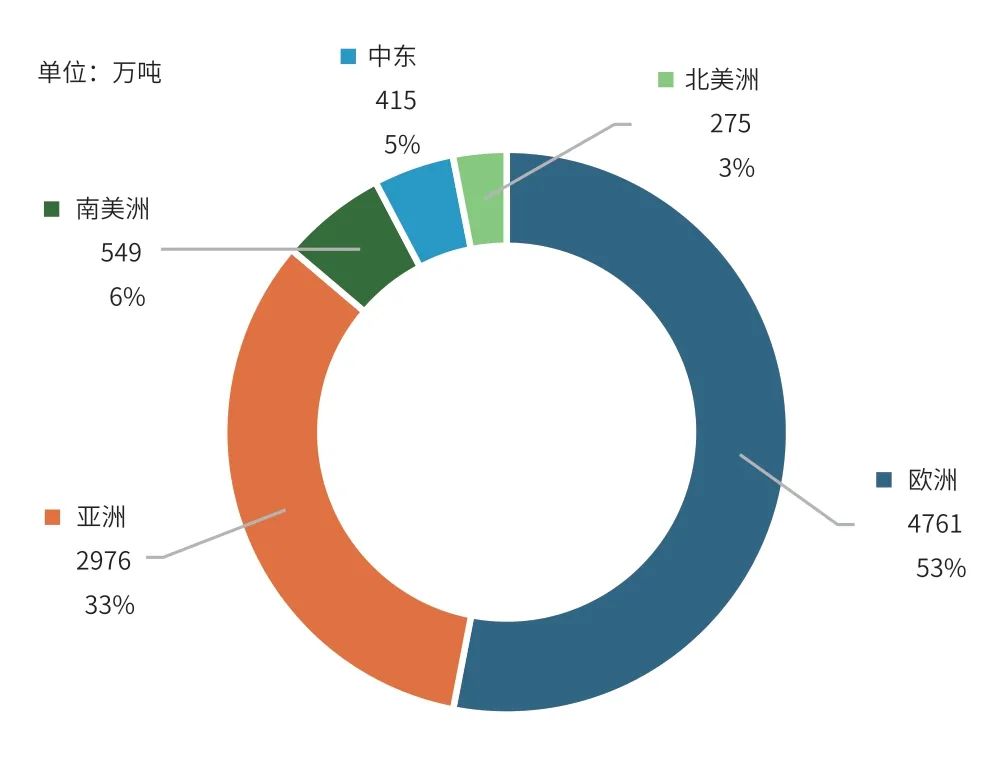2022年乌克兰危机爆发后,欧洲大幅压减自俄罗斯进口的管道天然气,并努力增加LNG进口以替代管输天然气的缩减。美国LNG具有较好的经济性和转运灵活性,成为欧洲进口LNG的替代主要来源。美国能源部数据显示,2024年约有4760万吨美国LNG出口至欧洲[1],占美国LNG出口总量的53%(见图7),美国已成为欧洲最大的LNG进口来源国。考虑到美国LNG某种程度上可看作全球LNG市场的“调峰资源”,未来全球天然气及LNG市场供需变化会影响美国LNG及相关原料气需求,进而影响亨利枢纽价格。