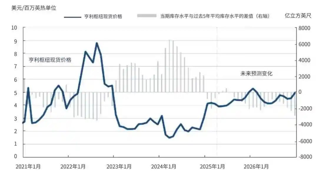 自2010年美国爆发页岩油气革命以来,大量页岩气开采使得美国天然气市场长期处于宽松状态,需求紧张情景较为罕见,因此亨利枢纽定价逻辑在相当长一段时间内由供应端驱动。随着美国天然气上游供应的增长面临不确定前景,下游新投产LNG设施驱动原料气需求增长,以及人工智能数据中心等工业和电力需求存在潜在增长,美国天然气市场格局或将由整体宽松逐渐转变为紧平衡,需求端变动对亨利枢纽价格的影响将更加显著。天然气市场阶段性供应偏紧情景或可导致供需平衡短期内承压,亨利枢纽价格波动将被放大加剧,亨利枢纽价格核心定价逻辑也由供应侧驱动转化为需求侧驱动。